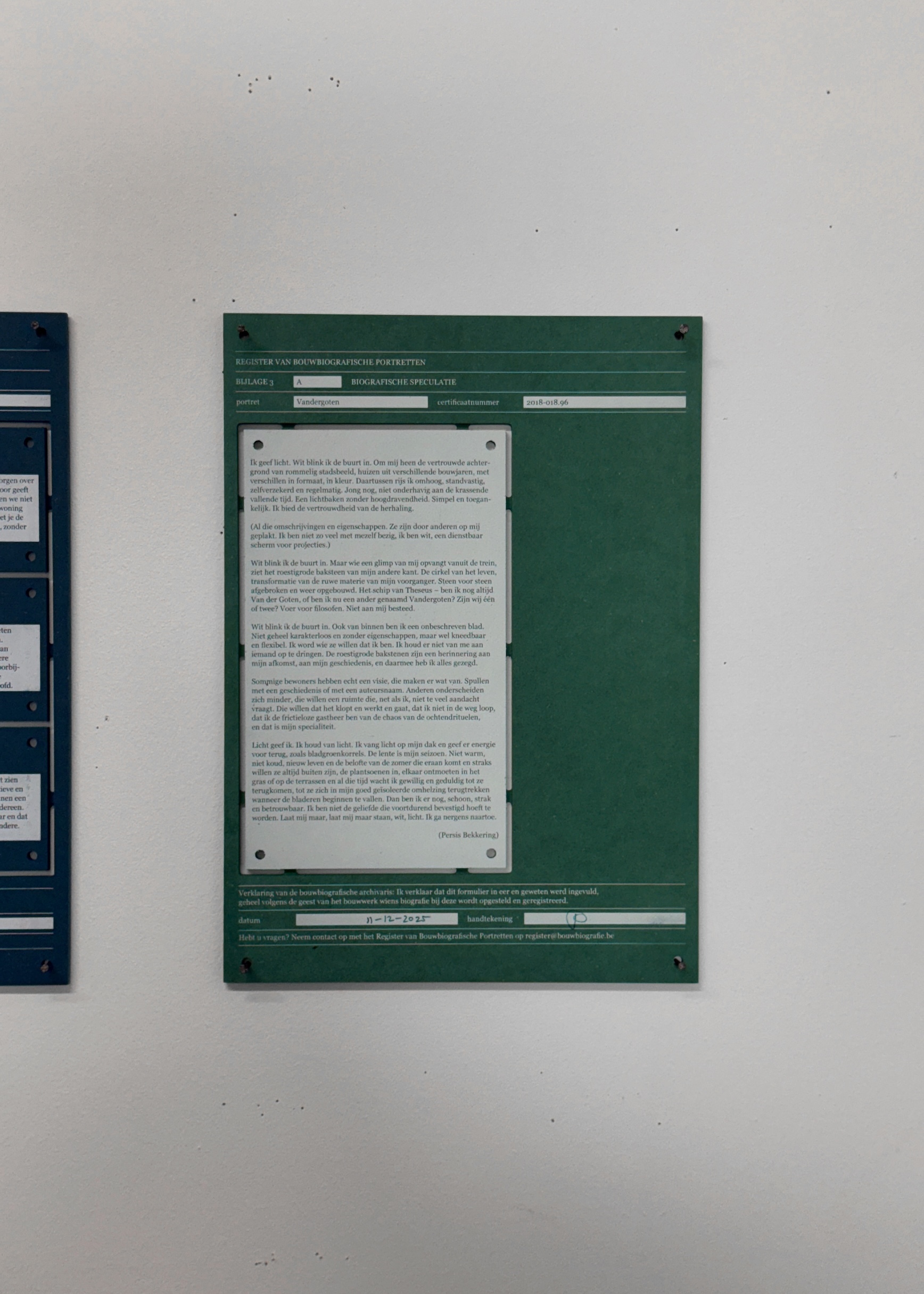 In 2025 werd door architecten Bart Decroos en Laura Muyldermans het Register van Bouwbiografische Portretten in het leven geroepen. Het Register gaf aan 17 gebouwen in Vlaanderen en Brussel de kans om hun stem te laten horen, hun verhaal te vertellen. Elk bouwbiografisch portret bevat de biografische gegevens, biografische karakteristieken en biografische speculatie van het bouwwerk. Voor dat laatste onderdeel schakelde Passa Porta vier schaduwauteurs in, die in de huid van elk huis kropen en hun diepste zielenroerselen in literaire pareltjes vervatten. Hier kan je de speculaties over het leven van de gebouwen Broustin en Galmaarden lezen, geschreven door Tijl Nuyts.