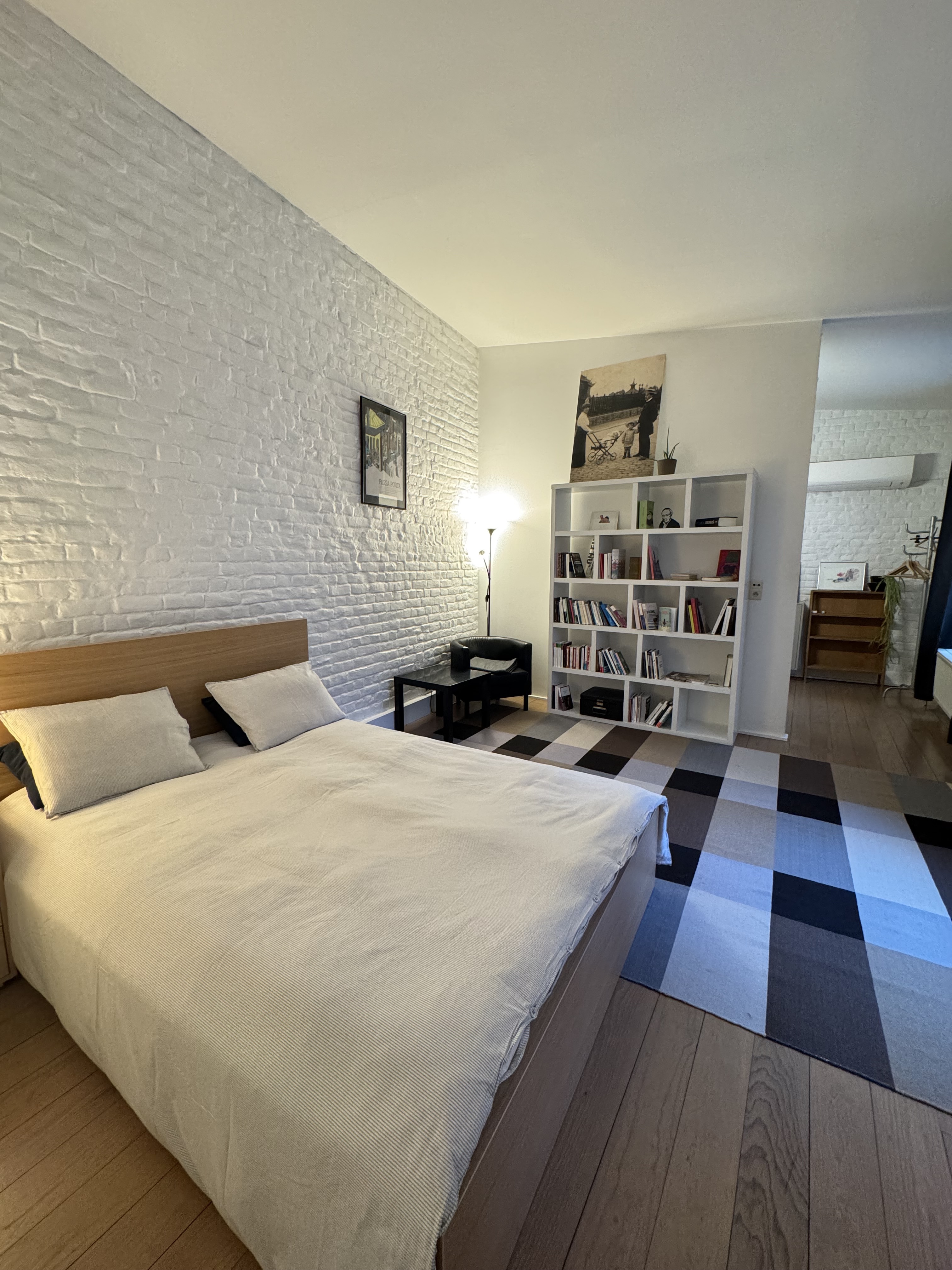 Op de tweede verdieping van literatuurhuis Passa Porta vind je de Studio, een geriefelijke kamer met een bureau, draadloos internet, een bed, een badkamer en een balkon dat uitgeeft op het gemeenschappelijke dakterras.