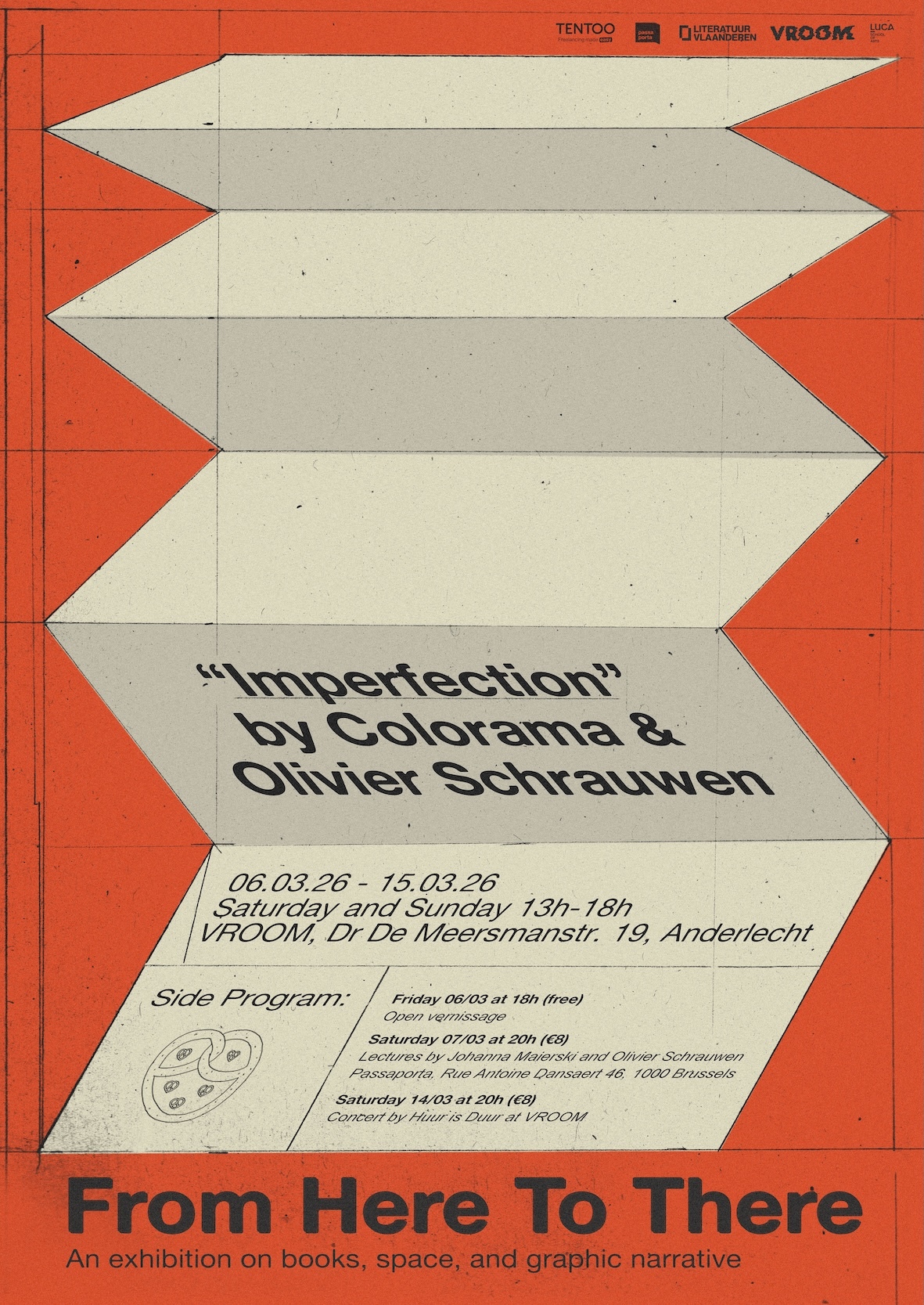 VROOM, het kunsthuis voor experimentele strips en hedendaagse tekenkunst uit Anderlecht, organiseert voor de vierde keer From Here To There, een serie van performatieve exposities rond grafische vertelkunst. In deze editie staan het werk van de Vlaamse striptekenaar Olivier Schrauwen en het Berlijnse uitgeefplatform Colorama centraal, met een dubbeltentoonstelling en een performance in Anderlecht, en een bijzonder gesprek tussen Schrauwen en Coloramastichter Johanna Maierski op zaterdag 7 maart bij Passa Porta.